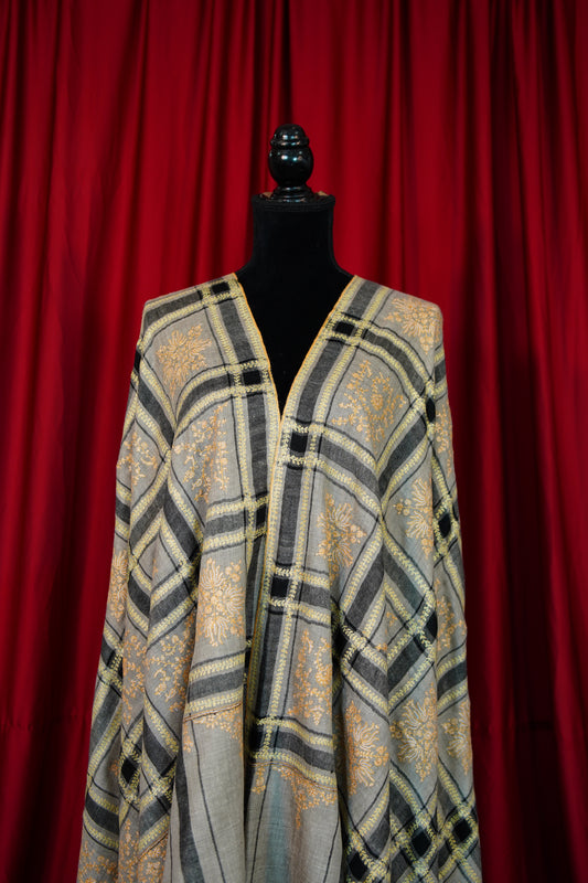 natural and black checked GI butis embroidery pashmina shawl 9908