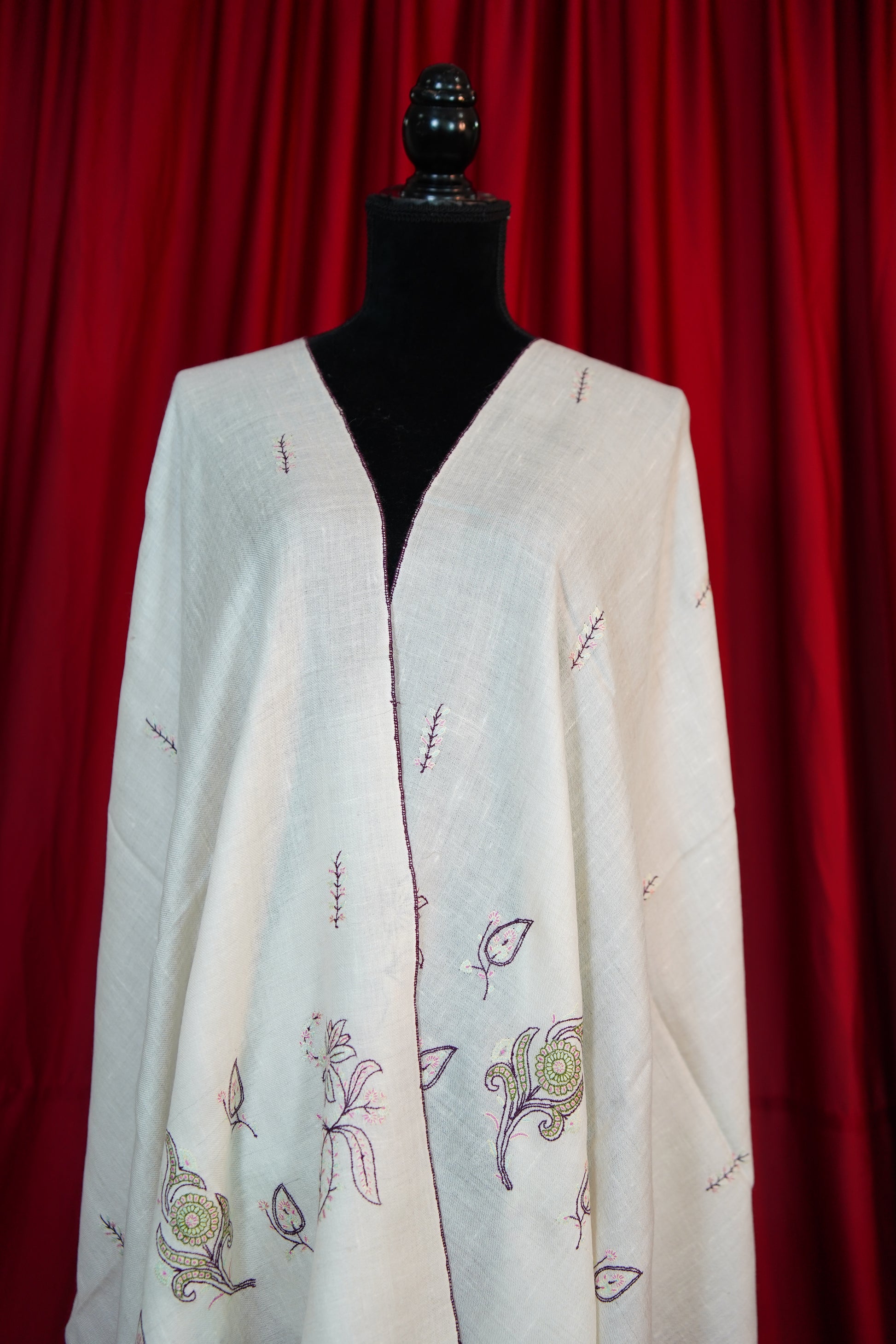 Elegantly hand-embroidered by skilled artisans, each stole features timeless Kashmiri motifs stitched with precision. The embroidery process can take weeks or even months, making every piece a testament to patience and heritage.