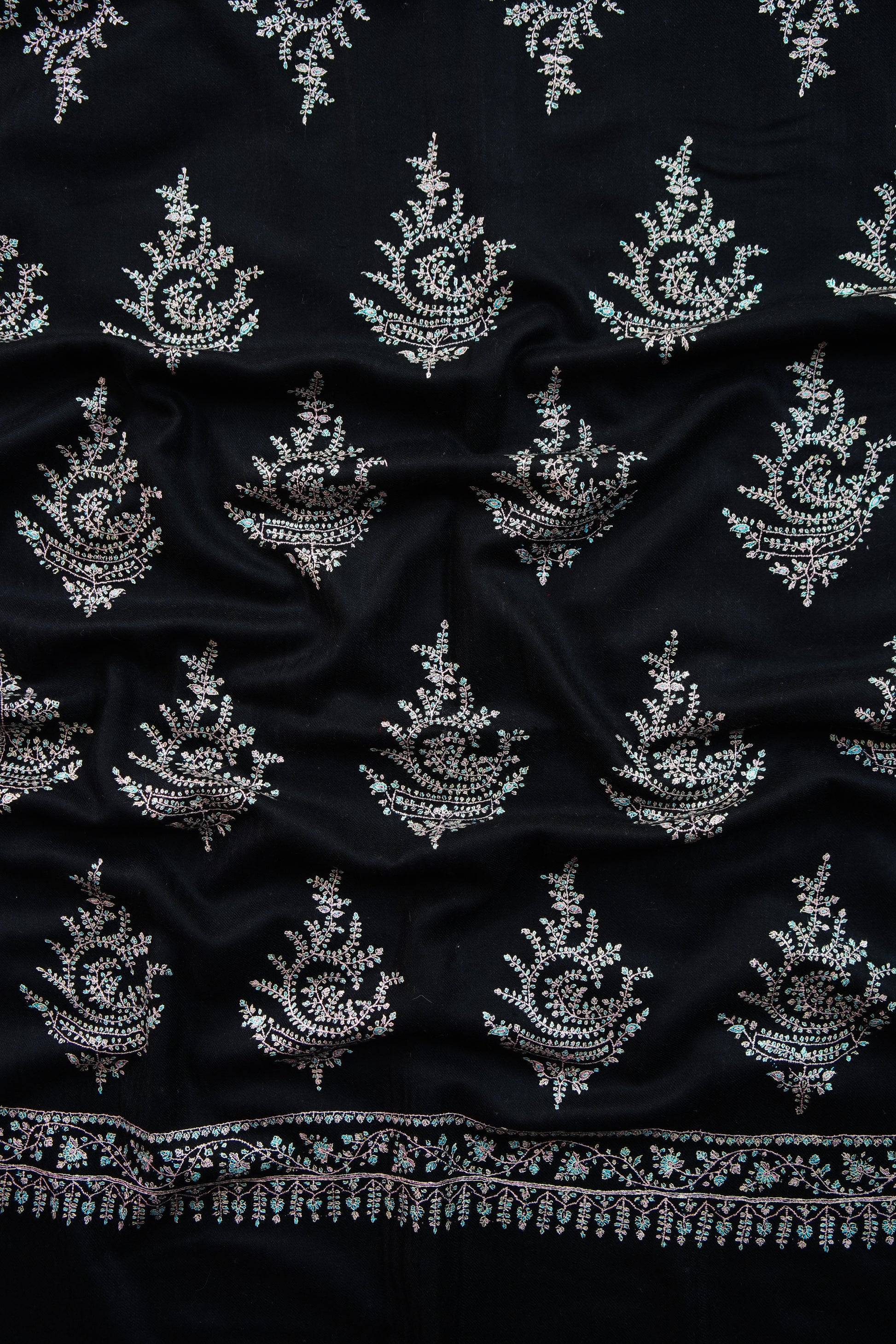 Elegantly hand-embroidered by skilled Kashmiri artisans, each stole features timeless motifs stitched with precision. The embroidery process alone can take weeks or even months, making every piece a rare expression of patience, legacy, and artistic heritage.