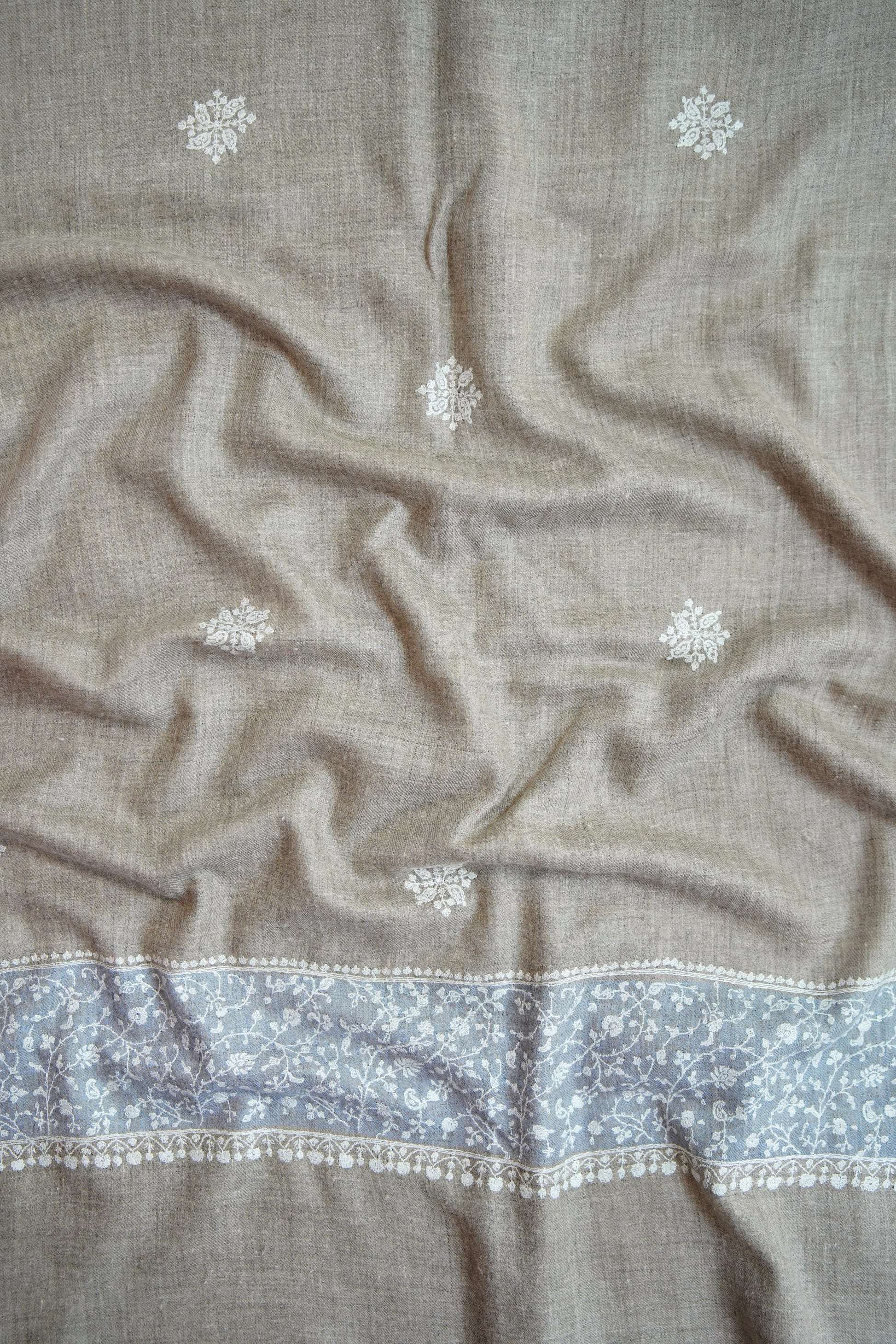 Elegantly hand-embroidered by skilled artisans, each stole features timeless Kashmiri motifs stitched with precision. The embroidery process can take weeks or even months, making every piece a testament to patience and heritage.