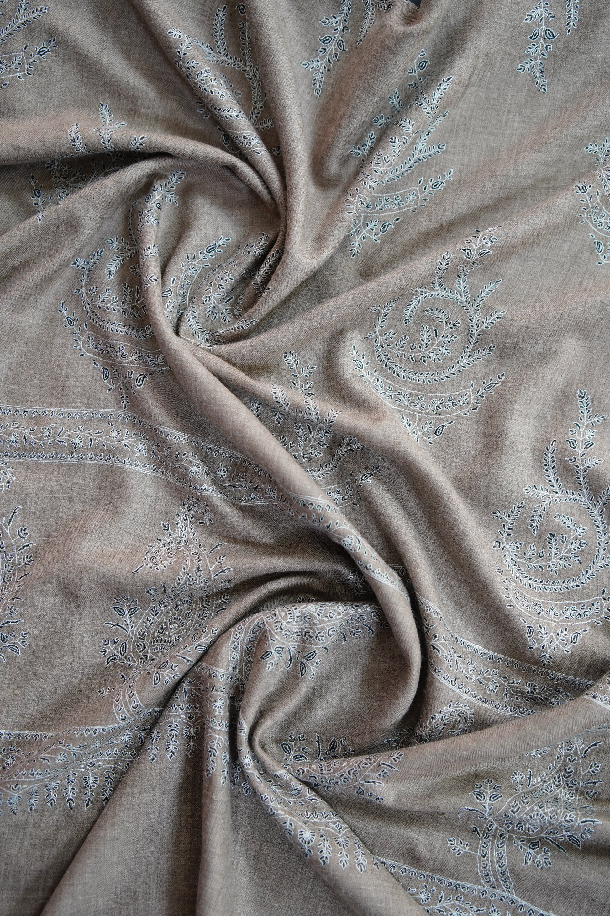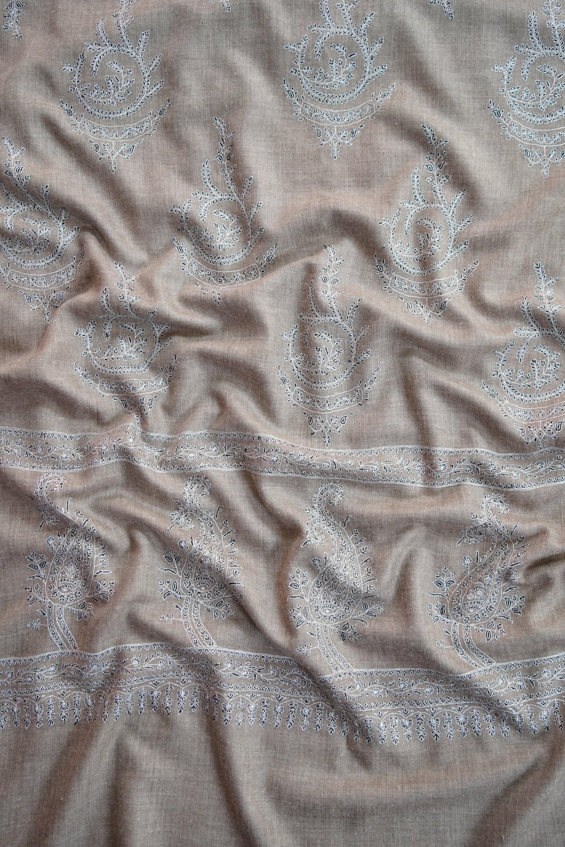 Patiently created by master artisans, every shawl is the result of months of devoted craftsmanship, where fine threads transform into poetry. The intricate motifs echo centuries of Kashmiri heritage—each stitch preserving a legacy, each pattern telling a story of tradition and pride.
