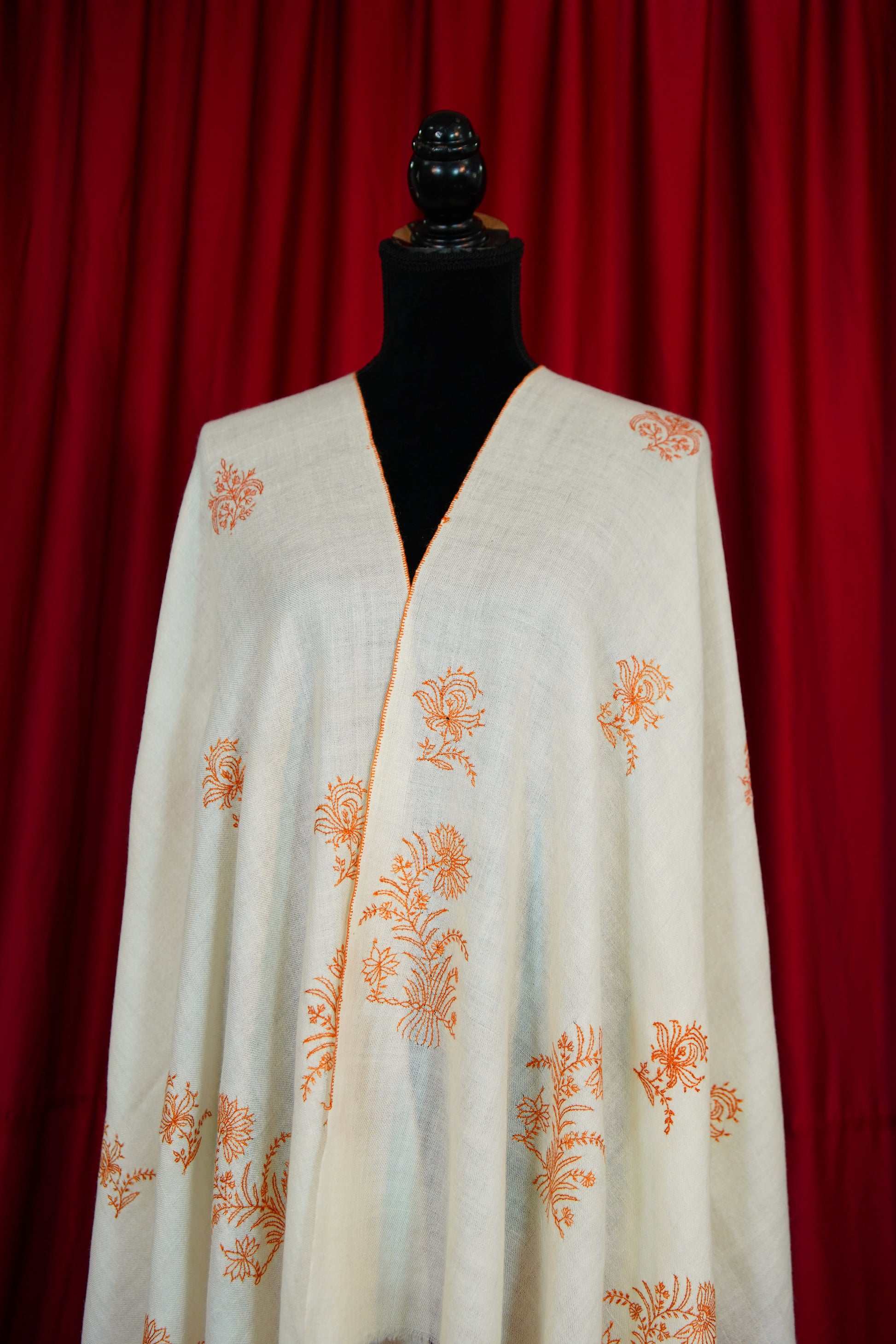 Elegantly hand-embroidered by skilled artisans, each stole features timeless Kashmiri motifs stitched with precision. The embroidery process can take weeks or even months, making every piece a testament to patience and heritage.